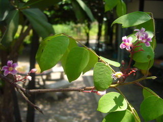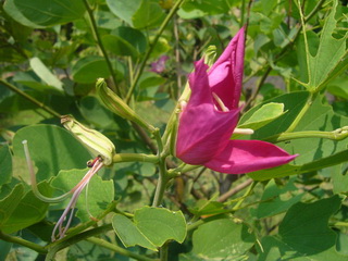 มีผลคล้ายฝักถั่ว ดอกใหญ่ออกที่ปลายยอด กลีบดอก 5 กลีบ ขนาดไม่เท่ากัน สีแดงอมส้ม